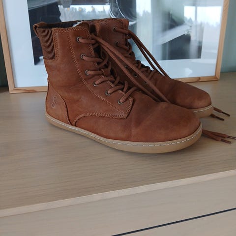 Bianco sneakers/joggesko i størrelse 36. Skoene er beige i ekte skinn med snøring og høyt skaft. De har metallhekter til lissene foran og flat gummisåle. Egner seg som hverdagssko i overgangssesonger og mildt vær.