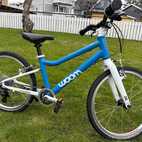 Woom barnesykkel med 20" hjul. Sykkelen har lett ramme med lav innstegshøyde og rett styre. Utstyrt med gir, felgbremser foran og bak, samt standard sete for barn. Fargekombinasjon i blått og hvitt, egnet for barn som passer til 20" hjulstørrelse.