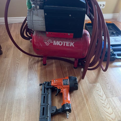 Den slangen som henger over kompressoren har løsnet fra festet sitt. Festet er knekt. Ser ut til å fungere uansett.