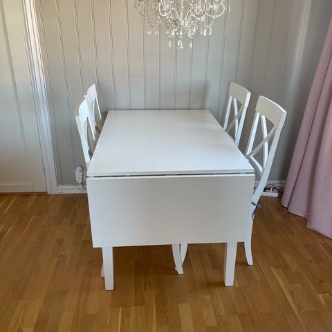 Pent brukt kjøkkenbord og to stoler selges grunnet flytting. Bordet kan foldes ut som en forlengelse.