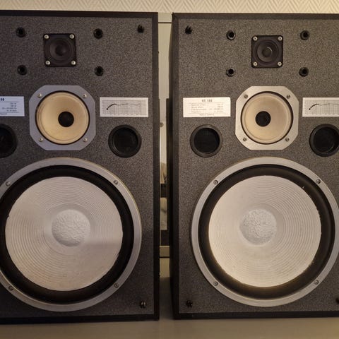 Høyttalerne spiller utmerket og fungerer teknisk som de skal. Kosmetisk har de bruksmerker; det er en synlig avskalling på baksiden av den ene kassen, samt diverse merker på kabinettene og noe slitasje på fronttrekkene (se bilder). Perfekt for god lyd i garasjen, verkstedet eller på kontoret.