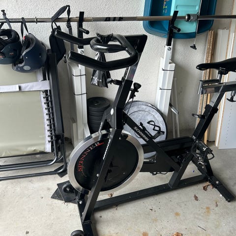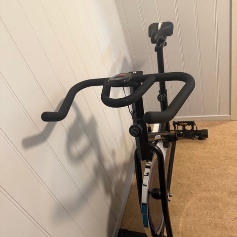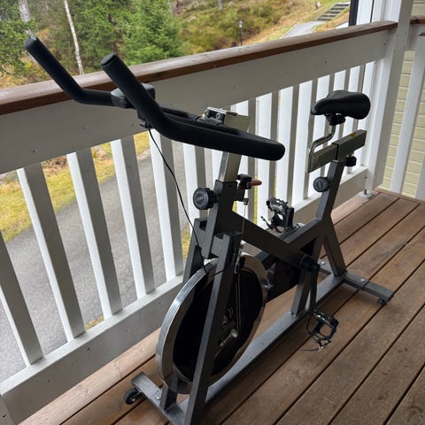 Spinningsykkel for innendørs bruk i svart farge. Sykkelen har justerbart sete og styre for tilpasning til ulike brukere. Utstyrt med pedaler med tåreimer for bedre fotfeste under trening. Egnet til kondisjonstrening og intervalløkter hjemme. Stabil ramme og svinghjul gir jevn tråkkmotstand for variert treningsbelastning.