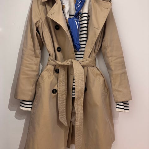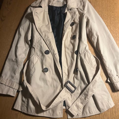 Beige trenchcoat fra merket Apt. 9 i størrelse Medium . Trenchcoaten er laget av et lyst, beige stoff med klassiske detaljer som brede slag og mørke knapper