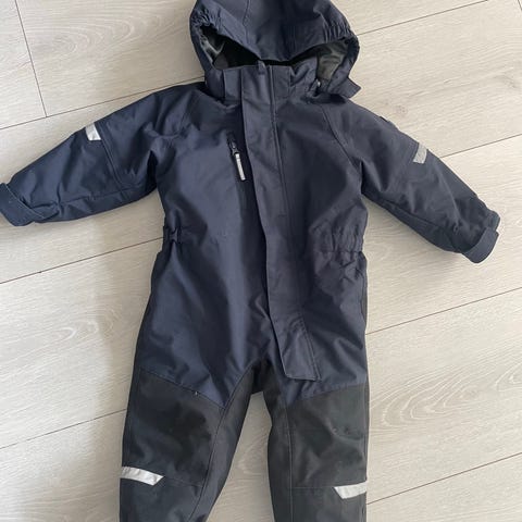 Hel og pen parkdress, størrelse 98. Avtagbar hette og refleksdetaljer. Mangler en strikk under skoen.