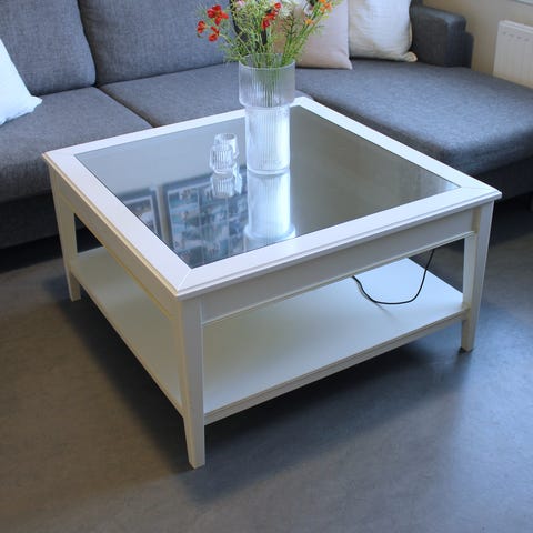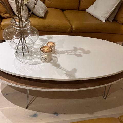 Pent brukt salongbord med glassplate selges, da vi skal ommøblere stua ifm gulvsliping. Diameter 95 cm.
