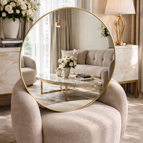 Rundt speil med tynn ramme i gullfarget metall. Speilet har enkel, glatt overflate og passer til bruk i gang, stue, soverom eller bad, avhengig av montering og plassering. Nøytral utforming gjør at det kan kombineres med ulike interiørstiler. Pent brukt.