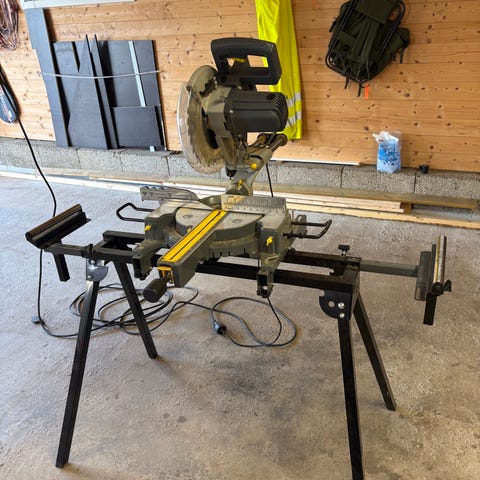 Maskinen er montert på et sagbord med sammenleggbare ben, som gir stabilitet under arbeid og enklere transport og lagring. Egnet for oppgaver som listverk, panel, rammer og annet snekkerarbeid der nøyaktige kapp og gjæringer er nødvendig. Ukjent alder, kjøpte den brukt for 6 år siden.