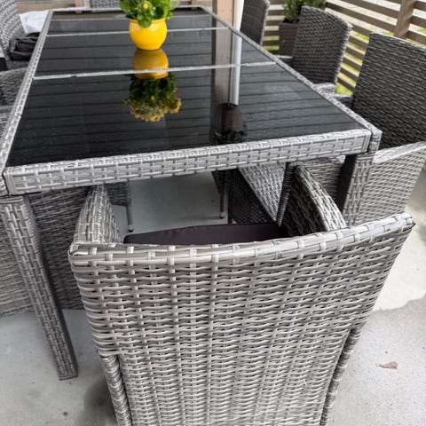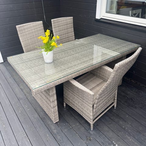 Spisegruppe utendørs bord og stoler rotting lys grå