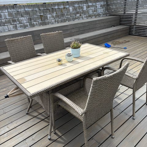 Spisegruppe for utebruk med rektangulært bord og tilhørende stoler i lys grå kunstrotting. Bordet har plate med bordplanker og rette ben. Stolene har buet rygg og armlener, samt flettet sete i samme materiale. Passer til terrasse, hage eller balkong som spiseplass utendørs.