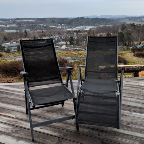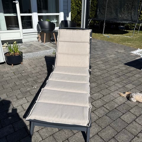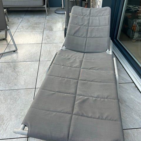 Solstol med regulerbar rygg, egnet for bruk på terrasse, balkong eller i hage. Stolen har ramme i metall og liggeflate i grått tekstilnett som slipper vann gjennom. Armlenene behøver litt kjærlighet, veldig god å ligge i. Tilhørende pute, som behøver en rens.