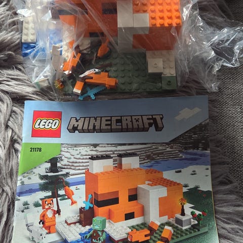 LEGO Minecraft byggesett. Esken viser et Minecraft-inspirert vinterlandskap med en stor oransje og hvit bygning, figurer og tilbehør. Passer for barn fra 8 år og oppover, og kan kombineres med andre LEGO Minecraft-sett for utvidet bygging og lek.