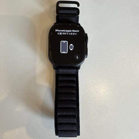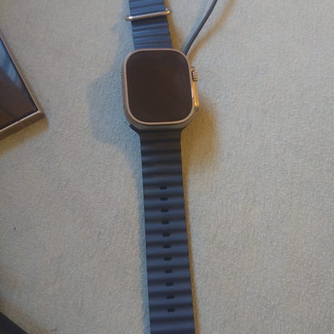 Apple Watch Ultra smartklokke med svart sportsrem. Klokken har rektangulært urkasse-design og leveres i original eske med tilhørende rem og dokumentasjon. Den svarte remmen er justerbar og festes med klassisk Apple-feste til klokken. Egnet som aktivitets- og hverdagsklokke med kompatibilitet til Apple-enheter som støtter Apple Watch Ultra-serien.
