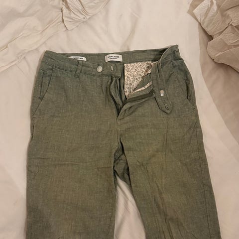 Zara bukse for herre i størrelse 44. Buksen er grønn og laget i lin. Klassisk modell med beltehemper og sidelommer. Passer til hverdagsbruk eller mer formelle anledninger avhengig av styling.