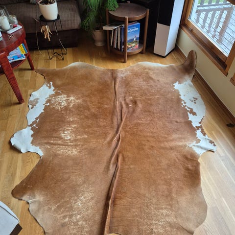 Ekte okse skinn fra Argentina selges. Pappa kjøpte dette da han jobbet på cruise skip i 1972. Strøken tilstand.