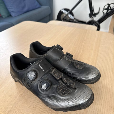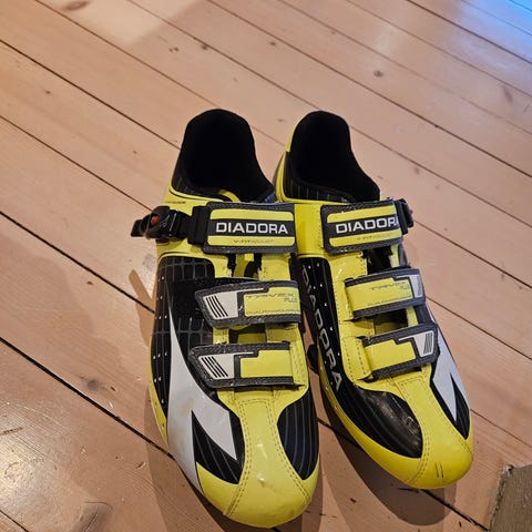 Diadora sykkelsko for landevei i størrelse 44. Skoene er svarte og har borrelås og strammehjul for justering av passform. Undersiden har feste for landeveisklosser. Pent brukte