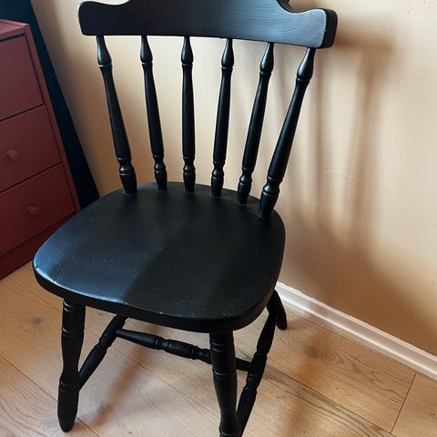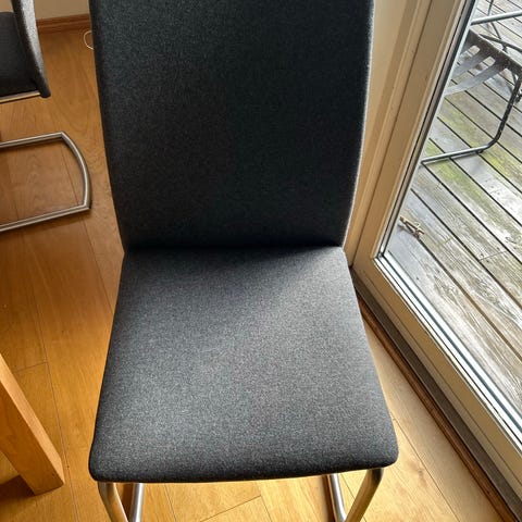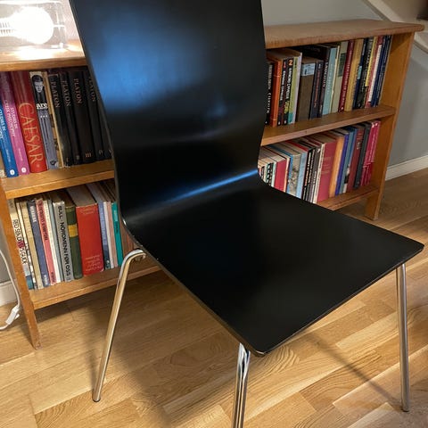 To stk kjøkkenstol i svart utførelse med slanke metallben. Sete og rygg er formet i et glatt skinnaktig, materiale med lett buet ryggstøtte for bedre sittekomfort. Stolens enkle og rette linjer gjør den egnet til bruk ved spisebord på kjøkken eller i stue, og den kan også brukes som ekstra stol ved behov. Designet gir et nøytralt uttrykk som passer inn i mange typer interiør.