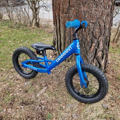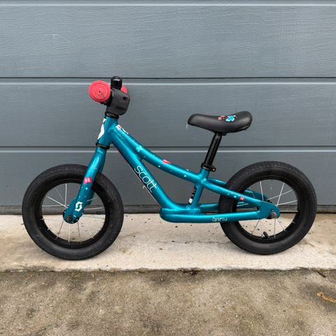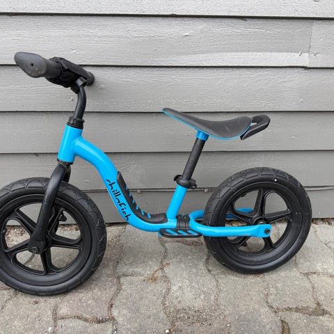 White xc120 balansesykkel med 12" hjul i blå farge. Modellen er en balansesykkel uten pedaler, egnet for mindre barn som skal øve på balanse og styreteknikk. Noen bruksmerker.