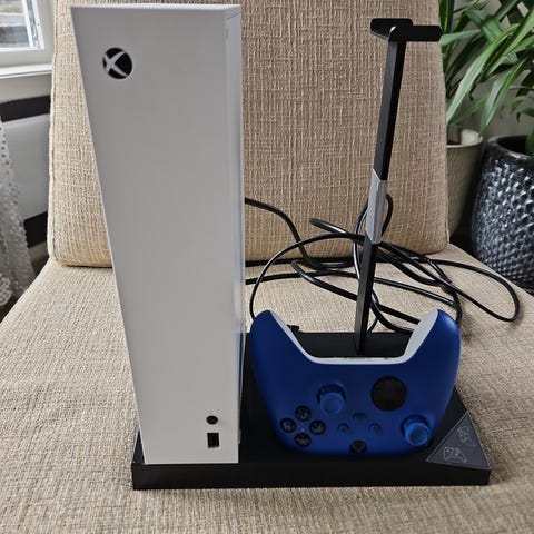 Microsoft Xbox Series S spillkonsoll i hvit farge. Digital konsoll uten diskdrev, egnet for nedlasting og spilling av digitale spill. Konsollen har flere tilkoblingsmuligheter på baksiden, inkludert HDMI, USB og nettverkstilkobling. Medfølgende trådløs Xbox‑kontroller i matchende hvit farge med standard knappelayout. Passer til bruk med kompatible Xbox Series‑spill og tjenester.