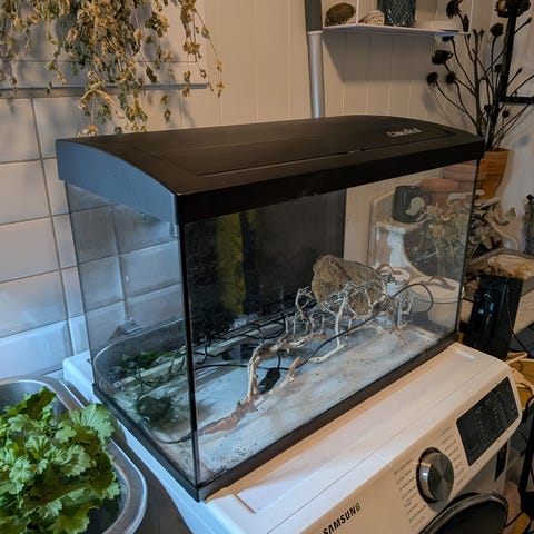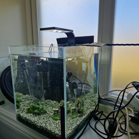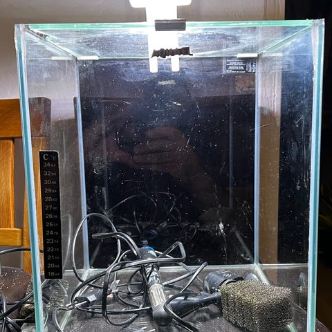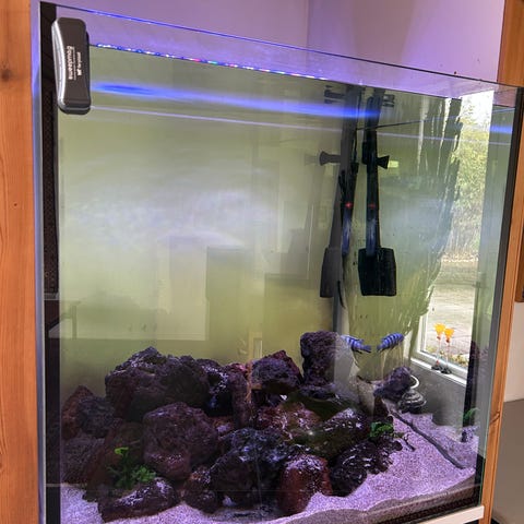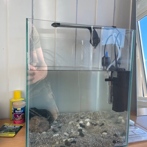 Karet er fylt og testet, all silikon er tett og pumpen virker som den skal. Om det ønskelig å få fortgang i innkjøringen kan jeg også sende med filterguffe fra mine innkjørte kar. Dette er et pent kar med buede fronter som gjør at det får et flott uttrykk. Passer perfekt til feks, neocaridina reker, pygmepansermalle, stjernedanio, dvergtannkarpe, otto, rubintetra, mikro krabbe ol.