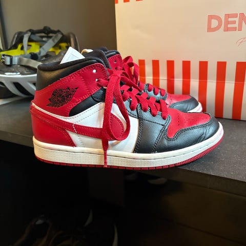 Nike Air Jordan 1 Mid joggesko i størrelse 42. Modellen er en høy sneaker med snøring og polstret ankelparti. Fargekombinasjon i rød, hvit og svart med klassisk Swoosh-logo på sidene og Jordan-logo på hælpartiet og pløsen. Overdel i syntetisk materiale og tekstil, perforert tåparti for ventilasjon og gummisåle med mønster for grep. Egnet som fritidssko og til hverdagsbruk.