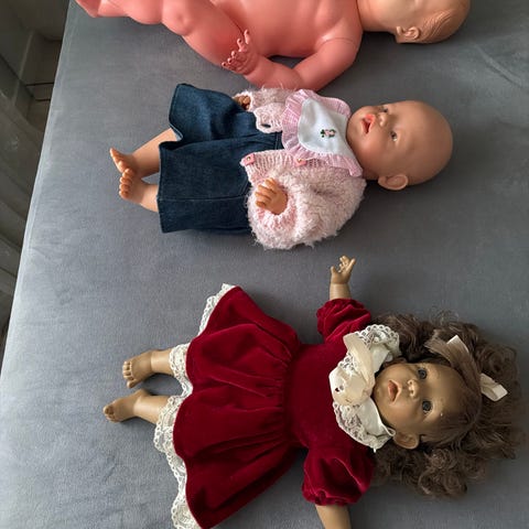 Baby Born dukke med blå øyne, iført rosa body med motiv og lue i rosa nyanser. Veldig lite brukt og uten bruksmerker. Med dukken følger potte, tåteflaske, tallerken og skje. Dukken er egnet til rollelek der barn kan øve på stell, mating og pottebruk. Klær og tilbehør er i plast og tekstilmaterialer som passer til dukkelek innendørs.