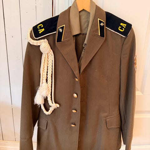 Sovjet militær uniformslue i klassisk modell. Luen er grå med rød kant og svart bånd rundt, samt plastskjerm foran. På fronten sitter et metallmerke med stjerne og laurbærmotiv. Innvendig har luen stempler og påskrifter som tyder på produksjonsår og størrelse. Egner seg som samleobjekt, rekvisitt eller til bruk i kostyme og historiske oppsett.