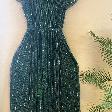 Elegant grønn kjole med mykt fall og fine draperte detaljer. Den har løse ermer og et luftig, flatterende uttrykk. 💚 Hadde den på meg i en brullpsfest (var da gravid) så passer best L/XL - se bilde for passform. Veldig behagelig! Pent og lite brukt