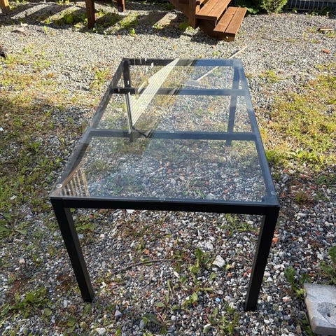 Rektangulært hagebord i metall i svart farge. Bordet har rette, enkle ben og en glatt bordplate som egner seg for bruk på terrasse, balkong eller i hage. Enkel, modern bord som passer til ulike typer utemøbler og uteplasser. Noe bruksmerker som vises frem i bildene.