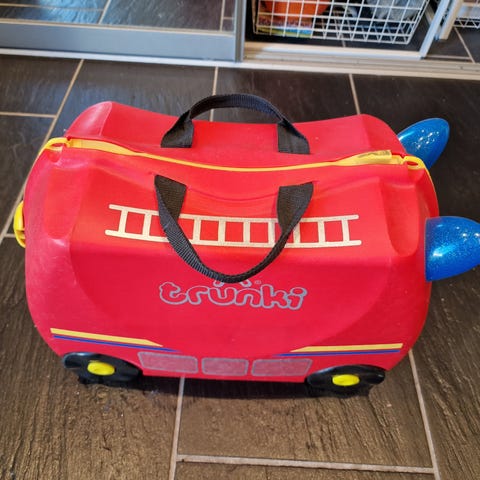 Molto Smiler Moto blå trillekoffert for barn. 50x23x34cm. Fin håndbagasje for barn. Formet som en motorsykkel som kan sittes på, og trekkes. Med bærestropp/trekksnor.