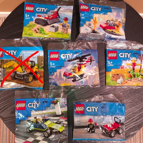 6 små poser med ulike Lego City sett.