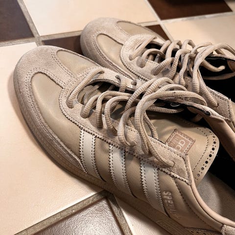 Veldig lite og pent brukt. Noe bruksmerke i form av at det har løsnet i sømmen i hælen på den ene og litt på yttersiden av den andre skoen (se bilder). Kan nok eventuelt sys, men funker slik de er også😊