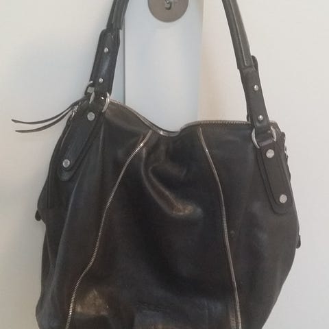 Sort skinnveske i glatt skinn og semsket skinn som er preget i kroko mønster. Lang og kort hank som gjør at du kan bære den i hånden og cross over. Gulldetaljer. De tre første bildene er lånt fra nettet.