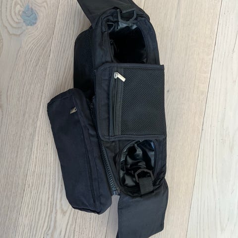 Britax organizer/koppholder til barnevogn i svart tekstil. Organizeren festes på håndtaket og har flere rom for oppbevaring av småting som flasker, kopper og tilbehør. Den har to kopp-/flaskeholdere som holder drikke varme/kalde, og et midtrom for nøkler, mobil eller andre små gjenstander. Passer til barnevogner som er kompatible med Britax-tilbehør av denne typen.