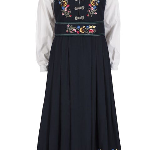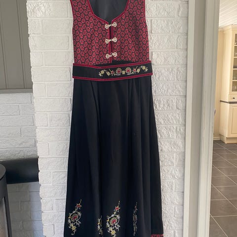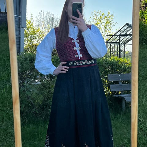 Festdrakten er kjøpt for mange år siden. Innsydd etter en størrelse medium.
