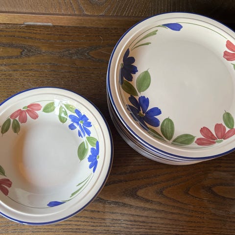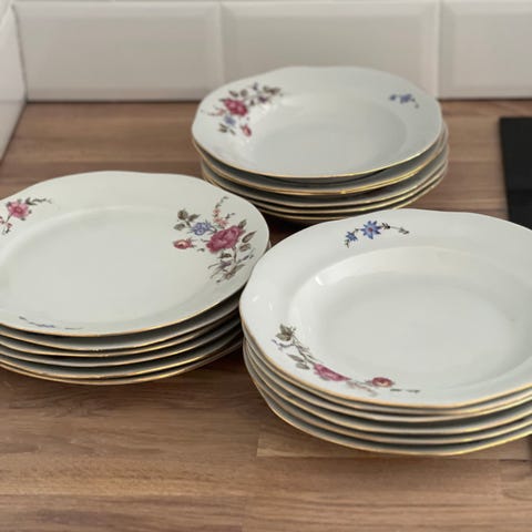 Servise til 6 personer med kopper og asjetter i hvitt porselen med røde blomsterdekor. Settet består av små asjetter og kopper med hank, egnet til kaffe, te eller dessertservering. Dekoren viser røde blomster med grønne stilker på både kopper og asjetter. Passer til bruk på kjøkken og spisebord i hverdagen eller ved enklere servering.