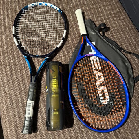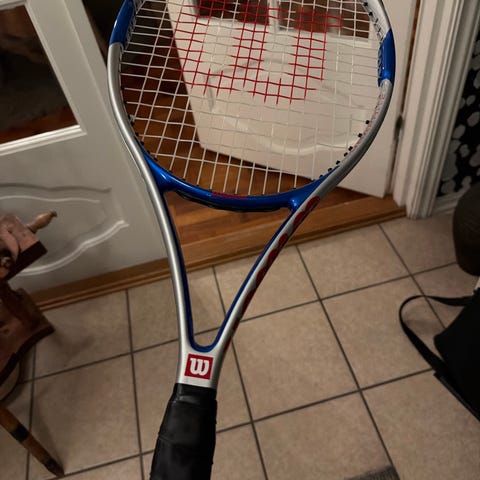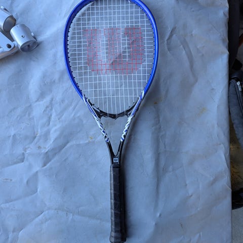 Selger en tennis racket med trekk.