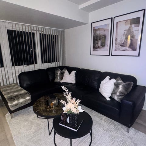 Selger en romslig og komfortabel hjørnesofa i ekte skinn. Sofaen har plass til opptil 8 personer og passer perfekt både til familie og gjester. Den har klassisk sort design, er enkel å holde ren og gir et moderne preg til stuen.