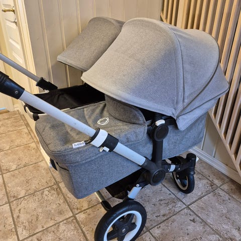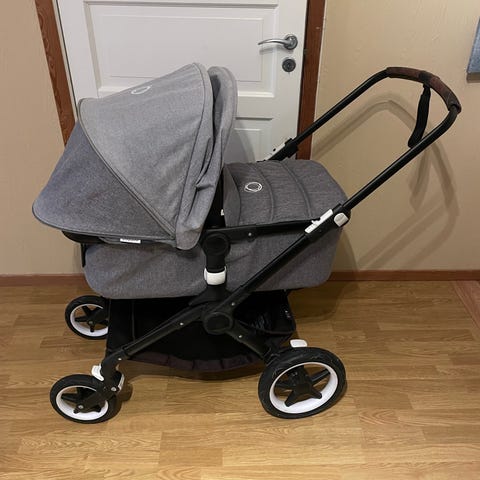 Bugaboo barnevogn i kombinasjonsløsning med liggedel og sittedel. Vognen har svart underdel og setetekstil, samt grå kalesje. Håndtak og ramme er i lys metallfarge med mørke plastdetaljer. Håndtak er litt slitt i stoffet, men dette kan byttes. Modellen har fire hjul, hvor de to fremre er mindre og svingbare for enklere manøvrering. Under vognen er det en oppbevaringskurv. Sittedelen kan justeres i ulike posisjoner og brukes både vendt mot den som triller og fremovervendt. Egner seg til bruk fra spedbarn med liggedel og videre som sportsvogn når barnet blir større. Vogna er fra 2018.