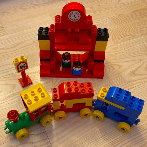 @ DUPLOsett m Verksted Biler TogStasjon Mennesker Bad Båd Babyleker