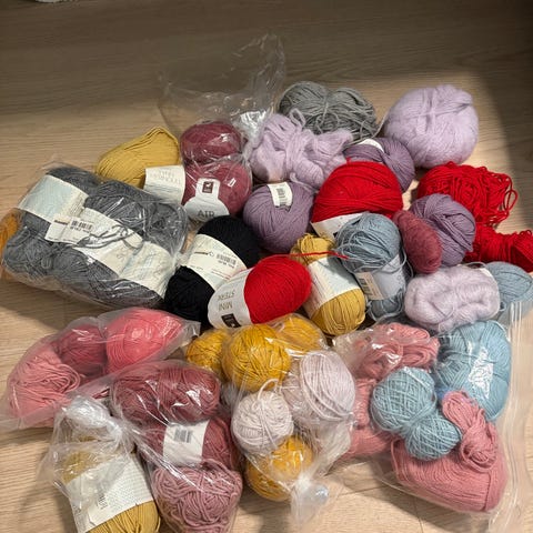 Blandet parti garn og strikkepinner. Garnet består av nøster i ulike farger som grå, lilla, blå, rød, hvit og oransje, samt ulike kvaliteter som blant annet merinoull og bomull (for eksempel Drops Paris). Det er både ensfarget og melert garn, i forskjellige tykkelser og rester av ulike nøster.