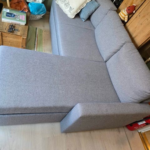 Pent brukt sofa selges, trenger en rens. Sjeselong henges i et feste på sofa, dette feste kan flyttes til både høyre og venstre med to skruer.