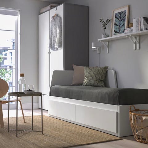 IKEA seng i hvit utførelse. Sengen har rygg- og sidepanel som gjør at den kan brukes både som sofa på dagtid og seng om natten. Under sengen er det to skuffer for oppbevaring av sengetøy eller andre ting. Målene på illustrasjonen viser at sengen kan trekkes ut til dobbel bredde. Passer i soverom, gjesterom eller små rom der det er behov for kombinert sitte- og soveplass.