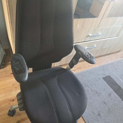 Skinnet er i veldig god stand, uten skader, og stolen er fullt funksjonell. Plastikken bak ryggstøtten og understellet har noen riper etter normal bruk (se bilder).
