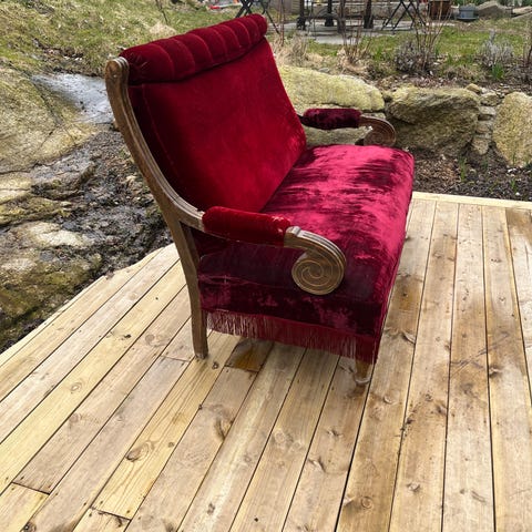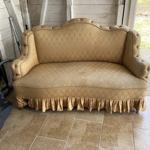 Sofa fra rundt 50 tallet i bjørk. Sofen trenger litt pleie og reparasjon. Lett å ta fra hverandre delene for omtrekking.