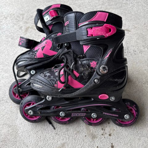 Justerbare Roces rulleskøyter for barn i størrelse 34-37. Modellen har justerbar innersko, høyt skaft og spennelås kombinert med lisser og borrelås for god tilpasning rundt foten. Skøytene har fire hjul på hver fot og plastchassis. Fargekombinasjon svart og rosa med mønsterdetaljer. Egnet til bruk på asfalt og andre jevne underlag for barn som vil drive med rulleskøyting.