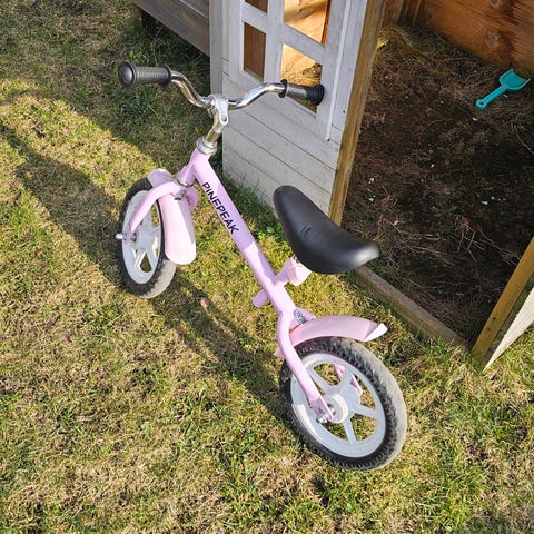 White Run balansesykkel med 12" hjul. Noen vanlige bruksmerker og slitasje, særlig på styret (se bilder). Trenger også litt luft i dekkene, men alt fungerer som det skal.