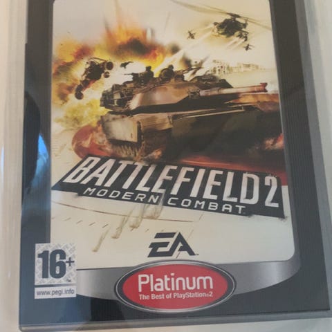 - Battlefield 2: Modern Combat Platinum (EA) – action- og krigsspill med moderne militære kjøretøy og 16+ aldersgrense.