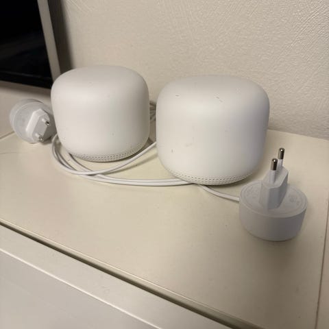 Google Wifi mesh-system. Settet består av tre runde enheter med tilhørende strømadaptere. Hver enhet fungerer som en ruter/nodestasjon i et trådløst mesh-nettverk og kan plasseres ulike steder i boligen for å gi jevnere dekning. Egnet for trådløst hjemmenettverk med flere rom eller etasjer.