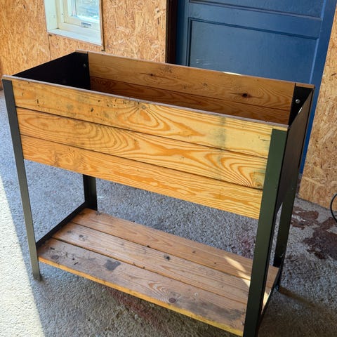 Rektangulær plantekasse øverst med god dybde til jord og planter, samt hylle under for oppbevaring av hageutstyr eller jordsekker. Egner seg til bruk på balkong, terrasse eller i hage for dyrking av blomster, urter eller mindre grønnsaker. Står på ben som gir behagelig arbeidshøyde og luft under kassen.