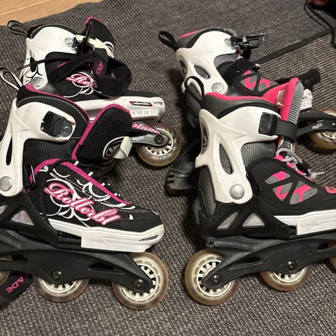 Rollerblade Ciclone rulleskøyter for barn. Rulleskøytene har justerbar størrelse innenfor et intervall fra skostørrelse, 36-39, med hard ytre støvel og mykere innersko for støtte og komfort. Fargekombinasjon i svart og hvit med rosa detaljer. Modellen har flere hjul på rad med bremsekloss bak på den ene skøyten.